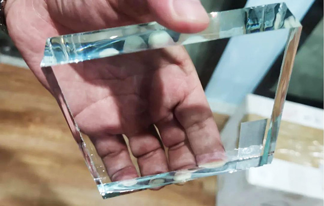田永剛向記者展示了新福興“至白”優質浮法玻璃、“至潤”超白浮法玻璃。這款為低自爆玻璃而生的產品,厚度在1.2~19mm之間,成分中氧化鐵含量不大于 0.015%,是具有高可見光透射比的平板玻璃。